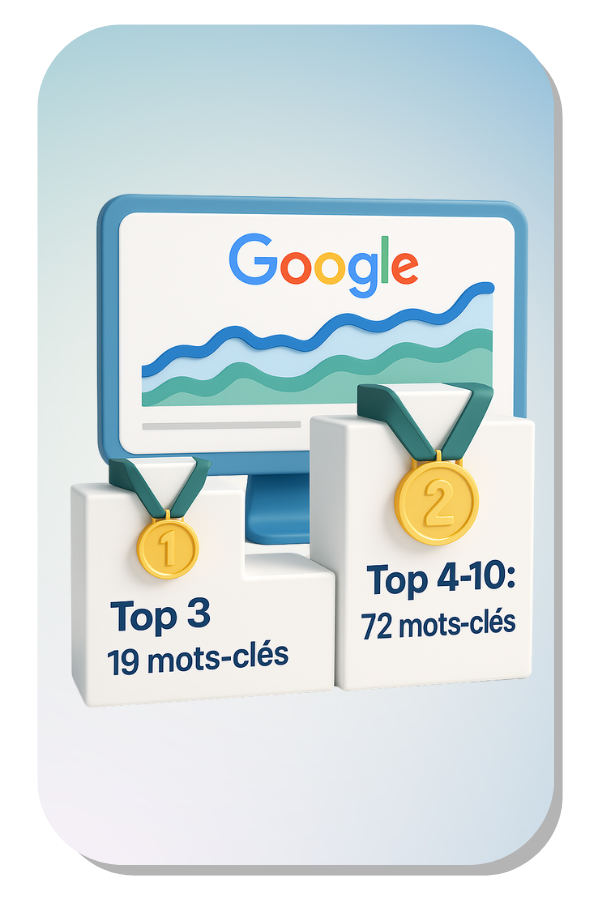 Grâce à ma méthode Kiné Web™, Yotéra apparaît dans le Top 10 Google pour 91 expressionsrecherchées chaque mois.