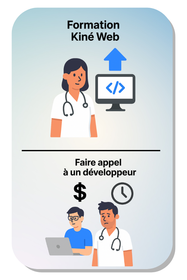 Avec Kiné Web™, tu investis une fois dans ta formation et tu es libre à vie. Plus besoin de supplier ton développeur pour ajouter une page ou modifier un tarif. Tu sais faire. Tu le fais. C’est simple.